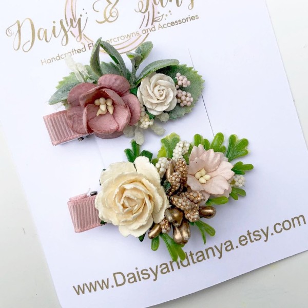 These adorable little handmade hair clips are made in a dusty pink colour scheme with some greenery on a pink alligator clip. Each clip measures approx. 7cm and comes in pack of 2. This would make the perfect accessory for your little baby for any occasion.