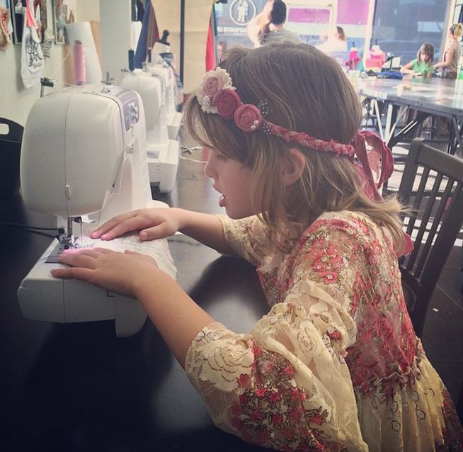 The sweet picture shows the little girl concentrating as she leans over a sewing machine.