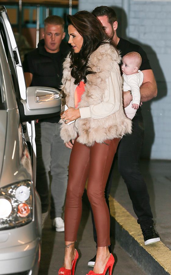In classic Katie style, the 36-year-old celeb went for a more adventurous outfit and teetered in sky-high heels and skin tight tan trousers for her appearance on the famous couch.