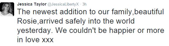 Taking to Twitter to confirm the news for fans and followers, the overjoyed new mum who announced her pregnancy just last month, paid tribute to the new arrival.