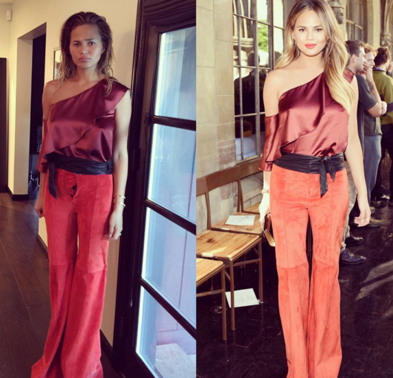 With her trademark humour, Chrissy decided to share her mishap online by posting a before and after shot of herself in the same 70s-inspired ensemble.