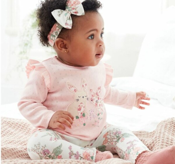 A super cute style for their everyday wardrobe. This three-piece set features a long sleeved top with bunny appliqué design, stretchy leggings and matching headband.