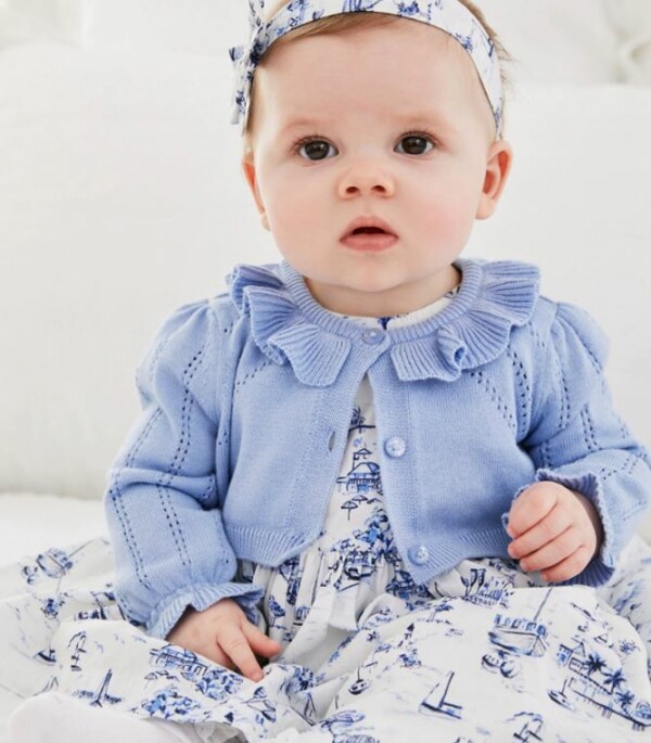 A stylish addition to mini wardrobes, this four piece set includes a prom dress, cardigan, knickers and matching headband. Made from a soft and breathable cotton, the dress is designed with a pretty blue and white floral design with lightly puffed sleeves, button back fastenings and matching knickers. The coordinating cardigan features a ruffle neckline and tonal button fastenings through the front. Machine washable. Headband, Knickers and Cardigan 100% Cotton. Dress Main 100% Cotton. Lining 100% Cotton. Mesh 100% Polyester.