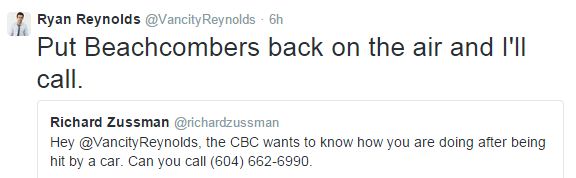 The frightening incident hasn't dulled the 38-year-old actor's sense of humour who, in response to queries put forward by CBC reporter Richard Zussman, tweeted: "Put Beachcombers back on the air and I'll call,"