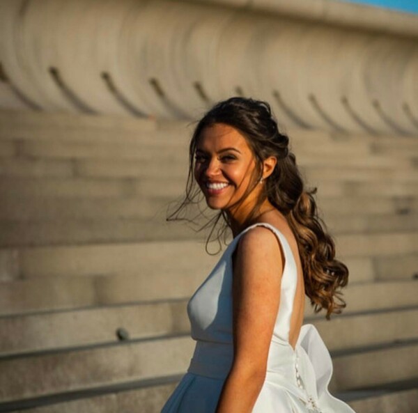 In this shot it appears that Paige’s dress is slightly backless, featuring an oversized bow and dainty buttons to cinch in her waist. Paige completed her bridal look by wearing her brunette locks in luscious curls.