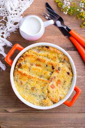 - Arrange the rest of the brioche and pour the remaining custard and add the rest of the sultanas on top. Bake for 35 minutes until the top is golden brown.