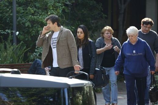 Dressed down in jeans and a tweed jacket, Ashton carried baby Wyatt in one hand and chatted on his phone with the other.