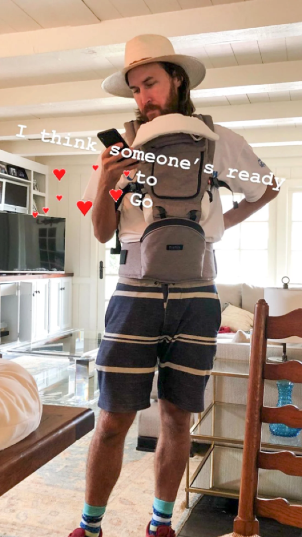 The musician went the extra mile by strapping on a front-facing baby carrier. He looks like an Indiana Jones super dad with his white fedora.