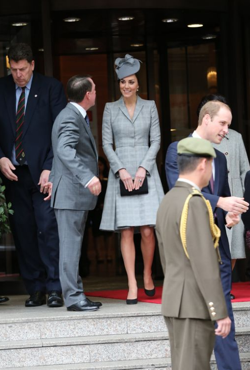 Looking gorgeous in a grey dress by Alexander McQueen and matching hat by Jane Taylor, Kate was waving and smiling as she and William entered the Royal Garden Hotel.