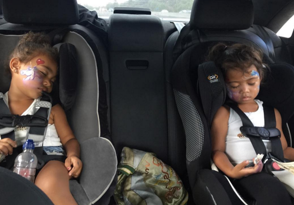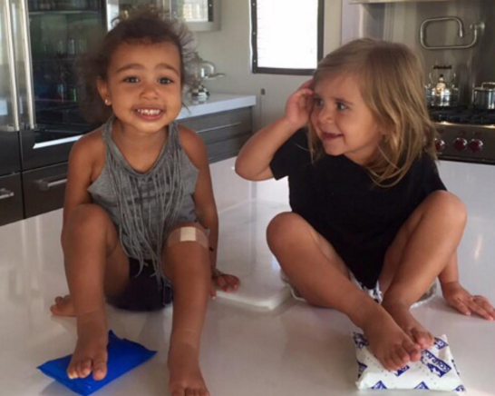 Uploading a snap of North and a little pal sleeping in the back of her car, Kim captioned the shot: "Knocked out!" before adding a heart emoticon to the message.