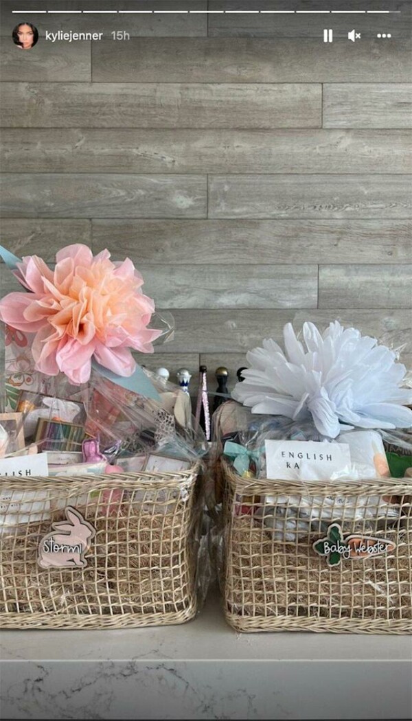 This past weekend, Kylie showcased two big baskets full of goodies, from her niece True’s fourth birthday party, as one was labelled ‘Stormi’ and the other was labelled ‘Baby Webster’.