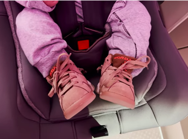 In the video, which is just over nine minutes long, the Keeping Up with the Kardashians star shares a seven second clip of her baby boy. The three-month-old is wearing a cute pair of brown and orange Air Jordan shoes.