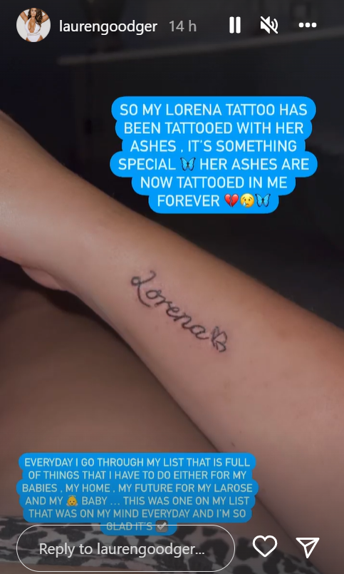 Former The Only Way is Essex star Lauren Goodger has shared a heartfelt tribute to her late daughter Lorena by getting her name tattooed on her.