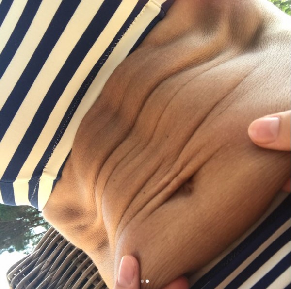 “After three kids, my tummy looks like a sharpei puppy…swipe left to see. My daughter is holding it…it’s one of her fave things – my rolls. She’s helped me love them too.”