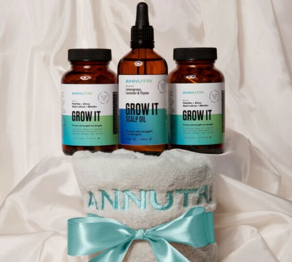 Annutri's Grow It Bundle includes two months' worth of their multi-award-winning, 100% natural, cruelty-free supplement Grow It, meticulously formulated to nourish your hair from root to tip. Enhancing its effectiveness is the Grow It Scalp Oil, a sumptuous, nourishing blend infused with active, natural ingredients such as Arnica Oil, Calendula Oil, and Amla Oil, as well as a gentle microfibre hair towel for added shine, volume and health. Buy here.