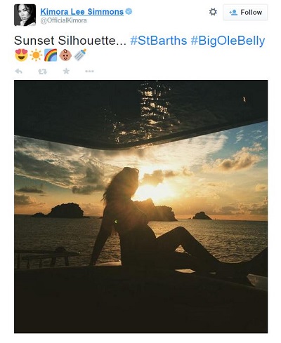 Taking to Twitter to share a shot of herself against a stunning sunset view, the star wrote: “Sunset Silhouette #StBarths #BigOleBelly”.