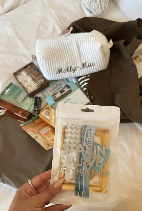 Lastly, the former reality star has treated each guest to a set of personalised items and essentials. The thoughtful kit features everything from a disposable camera and skincare items, to plasters and a personalised bathrobe.