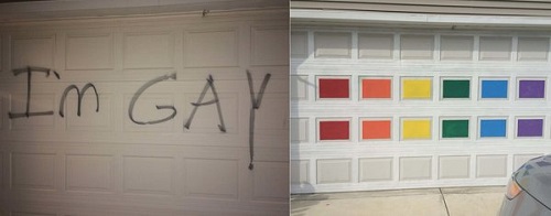 Erin and Joe Kennedy DeLong were left dismayed when, last week, their 17-year-old daughter Miranda woke them up to inform them that someone had spray-painted “I’m gay” across their garage door during the night.