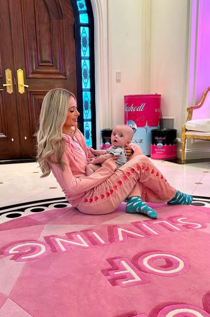 Alongside photos and a cute video of her wearing a matching pink tracksuit as she cradles her son while he looks around the brightly-decorated room, Paris revealed her ‘life feels complete’ since he made his arrival into the world.