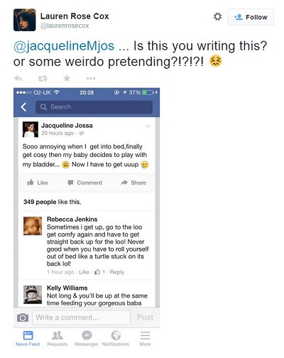 Jacqueline’s attention was brought to the imposter after a follower sent a screenshot of a post which read: “Sooo annoying when I get into bed, finally get cosy then my baby decides to play with my bladder…Now I have to get uup”.