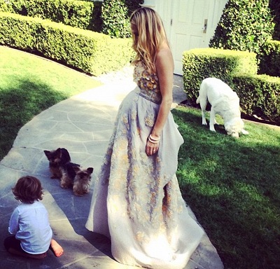“Hanging out in a ballgown,” wrote the star, adding in the hashtags ‘love my family’ and ‘feeling very pregnant’.