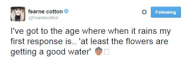 Fearne's fans were only too delighted to share their feelings on the star's post which read: "I've got to the age where when it rains my first response is..'at least the flowers are getting a good water...'.