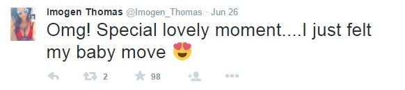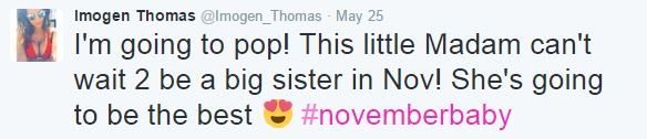 Taking to Twitter during a relaxing family getaway, former Big Brother star, Imogen Thomas, updated her legions of Twitter followers on the progress of her burgeoning bump and melted hearts in the process.