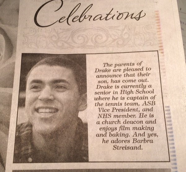 “The parents of Drake are pleased to announce that their son has come out. Drake is currently a senior in High School, where he is captain of the tennis team, ASB Vice President, and NHS member. He is a church deacon and enjoys film-making and baking. And yes, he adores Barbara Streisand.”