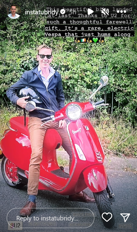 He wrote, “This beautiful bike landed at last. Thanks to U2 for such a thoughtful farewell gift. It’s a rare, electric vespa that just hums along”.