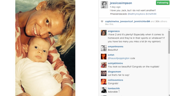 Family Life Celebrity Articles list Singer rules out having any more children Jessica Simpson has said that she won’t be having any more children for now. The singer uploaded an adorable photo of herself and a friend’s baby, writing: “I love you Jack, but I do not want another!! #maxiandacedo.” Jessica and her new husband, Eric Johnson, are parents to two-year-old, Maxi, and one-year-old, Ace.