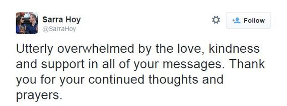 “Utterly overwhelmed by the love, kindness and support in all of your messages. Thank you for your continued thoughts and prayers”, Sarra wrote.