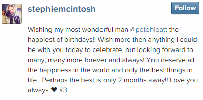 “Wishing my most wonderful man @petehieatt the happiest of birthdays!! Wish more than anything I could be with you today to celebrate, but looking forward to many, many more forever and always!”