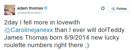 The actor, who plays Adam Barton on the soap, announced the news on his Twitter account, writing: “2day I fell more in lovewith @Carolinejanexx than I ever will do!Teddy James Thomas born 8/9/2014 new lucky roulette numbers right there ;)”