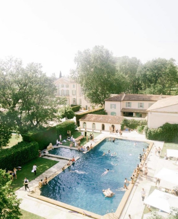 There’s also an aerial view photograph of a truly magnificent French villa complete with a large back garden pool, with small crowds of people scattered around. This is possibly a snapshot of a celebratory casual pool-party for wedding guests to enjoy either the day after or the day before the wedding.