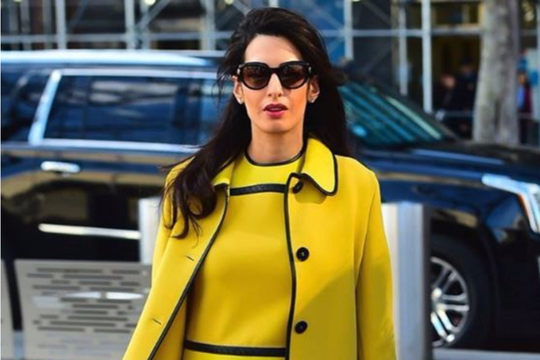 Amal, who is pregnant with twins, looked stunning in a vibrant yellow dress with black piping, matching jacket and black sunglasses.