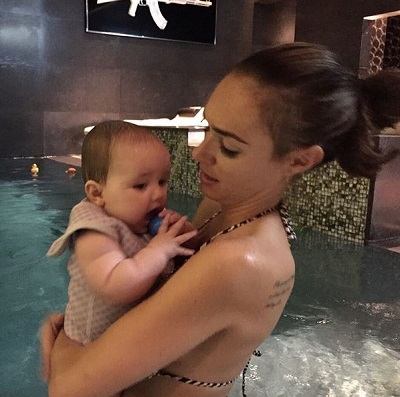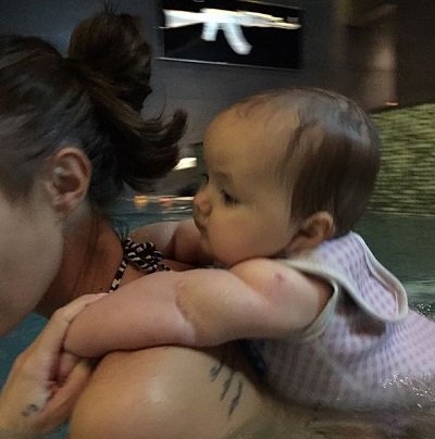 The socialite, who brought her seven-month-old to her father Bernie’s birthday party last night, has shared some beautiful photos of her baby’s trip to the swimming pool.