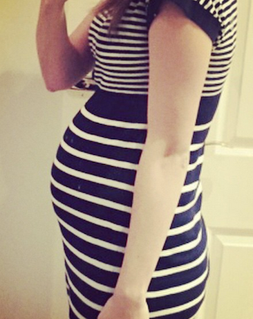 The stunning brunette’s latest snap shows her in a navy and white striped nautical themed dress which hugs her lovely bump and the clearly excited mum-to-be captioned the post: “Growing!!!!! Babyyyyyy”
