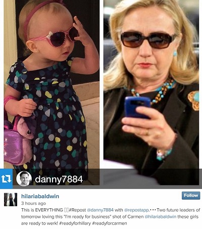 Posting some adorable shots of her little one looking all business in her sunglasses and handbag, yoga instructor Hilaria asked her followers to caption the photos - resulting in a hilarious likeness to Hilary Clinton!