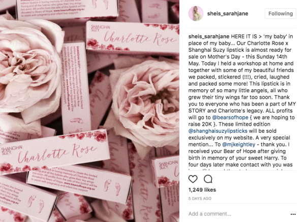 Then, Sarah Jane collaborated with a lipstick brand to create a shade of pink which was named Charlotte Rose and all the profits will go towards a charity called Bears of Hope which supports families who experience the loss of their baby.