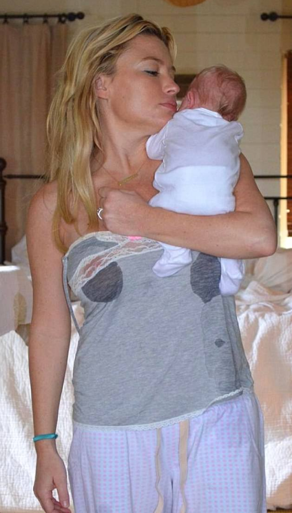 She shared a very intimate picture of herself in her nightwear after what looks like a tough night with one of her two children as an infant. The baby is snuggled happily on her shoulder as she nuzzles him lovingly. Breast milk has leaked through her top making dark wet circles. You can also tell that it has leaked down and dried, by the stains on her top.