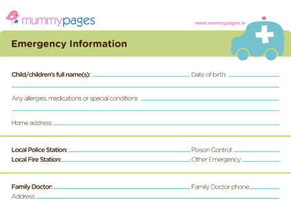 Prepare for anything with our emergency information sheet. Print it, fill it in with your emergency contacts, doctors number, key contacts etc and stick to the fridge or the inside of a cupboard door. That way, no matter who is minding your little one, they will always have access to the necessary information.