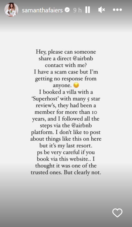 The 31-year-old penned, “Hey, please can someone share a direct @airbnb contact with me? I have a scam case but I'm getting no response from anyone”.