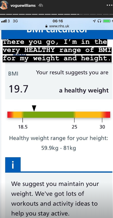 Sharing her BMI on her Instagram Story, she wrote; "There you go, I'm in the VERY healthy range of BMI for my weight and height."