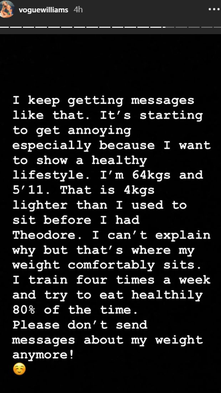 She continued; "I'm 64kgs and 5'11. That is 4kgs lighter than I used to sit before I had Theodore. I can't explain why but that's where my weight comfortably sits."