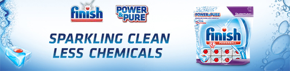New Finish Power & Pure is an innovative detergent that delivers the sparkling clean you would expect from Finish but with less chemicals. The unique formula powered by Active Oxygen blasts through grease and baked on food residue while giving you the comfort of knowing it contains fewer chemicals.