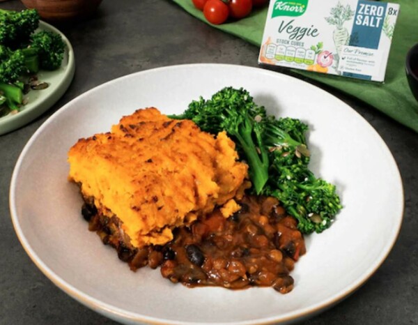 Spoon the bean mix into an ovenproof dish and top off with the sweet potato mash, scoring the mash with a fork.