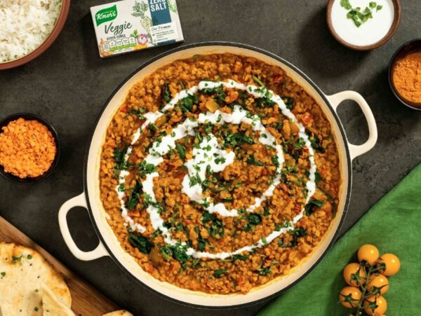 Wash the lentils, strain, add to a pot and pour in the water with the Knorr Zero Salt Veggie Stock Cube. Bring to the boil, turn down the heat to a simmer and gently boil the lentils until cooked for about 15-20 minutes, set aside.