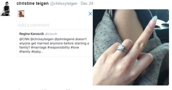 Addressing the remarks which had no grounding in reality when it comes to Chrissy and John’s relationship, the pregnant model uploaded an image of her engagement ring beside a finger which left social media users in no doubt as to Chrissy’s feelings on the matter.