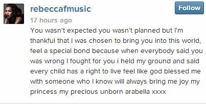 The singer uploaded an image of her ultrasound to her Instagram account last night and wrote: “You wasn’t expected you wasn’t planned but I’m thankful that I was chosen to bring you into this world ... feel a special bond because when everybody said you was wrong I fought for you. I held my ground and said every child has a right to live, feel like god blessed me with someone who I know will always bring me joy, my princess my precious unborn Arabella xxxx.”